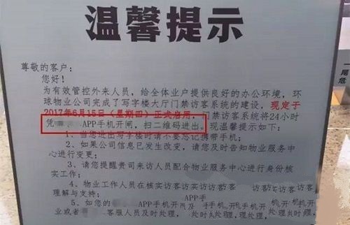 近日在成都便發(fā)生了一起“移動(dòng)門禁擾人事件”:某區(qū)部署移動(dòng)門禁,開啟APP進(jìn)出時(shí)代。簡單地說便是要求住戶在進(jìn)門前必須下載安裝APP,通過軟件掃碼進(jìn)入,如以下告示所示: