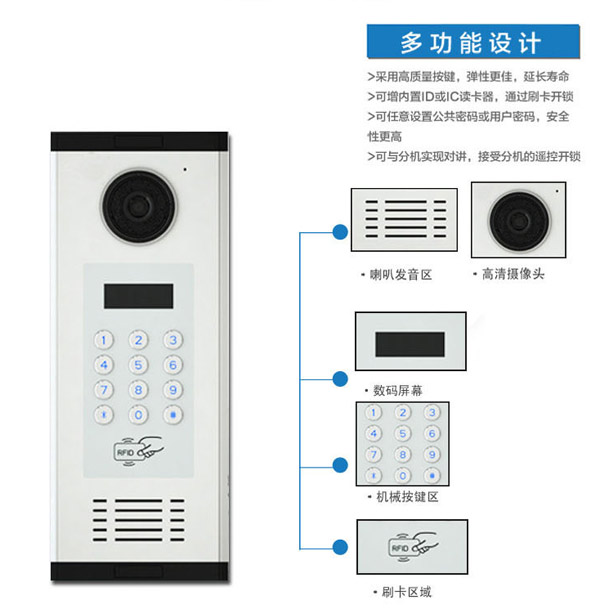 內置CCD高清攝像頭,可設置密碼開鎖,上電與斷電兩種開鎖方式可選,鑲門或嵌墻安裝